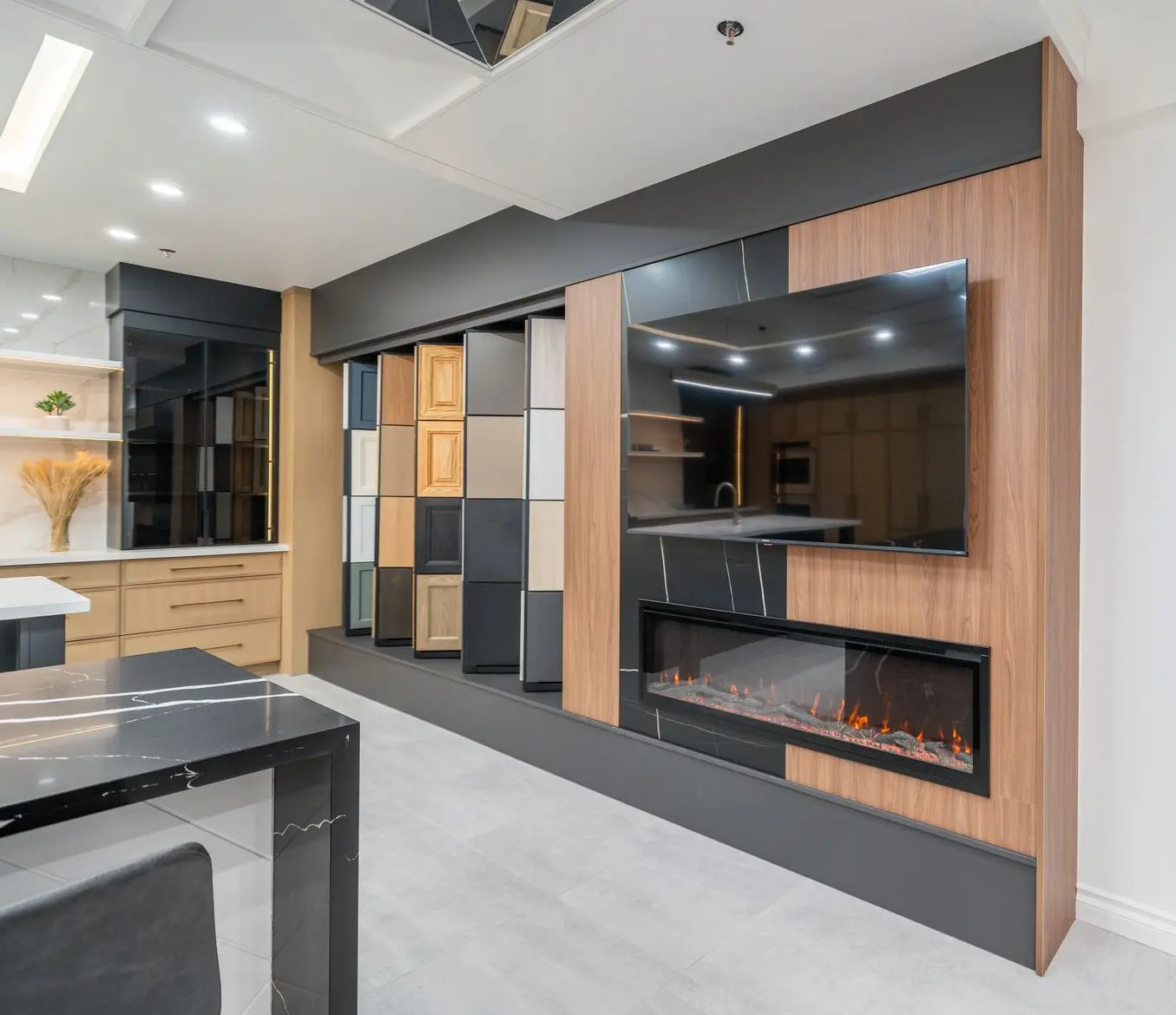 The showroom’s visual narrative is anchored by the interplay of matte black cabinetry and warm oak, a pairing that brings both depth and balance to the space. Integrated LED lighting enhances this dialogue, casting soft illumination across surfaces and emphasizing the subtle nuances of grain, finish, and form.