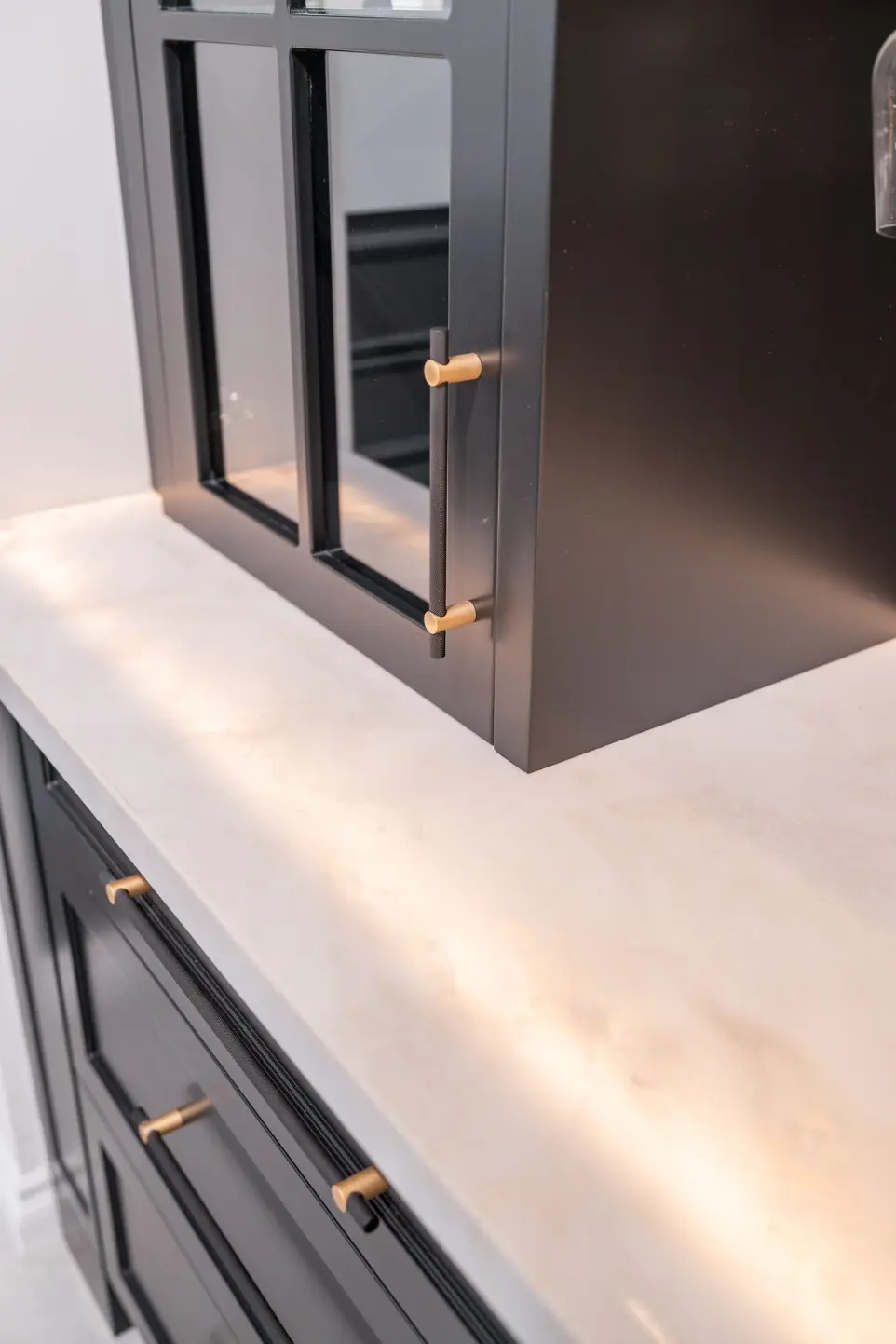 Custom accents, including a fluted hood feature, brass detailing, and glass-front cabinetry, add layers of sophistication, demonstrating the versatility and craftsmanship behind each design solution.