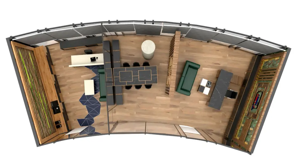 The concept introduces a refined interplay of materials and forms, beginning with textured and illuminated feature walls that establish a strong visual identity. These surfaces add depth and warmth, while layered lighting highlights their detail and creates a comfortable, inviting ambiance throughout the space. Geometric floor accents introduce movement and subtle wayfinding, subtly defining circulation paths without the need for physical barriers.