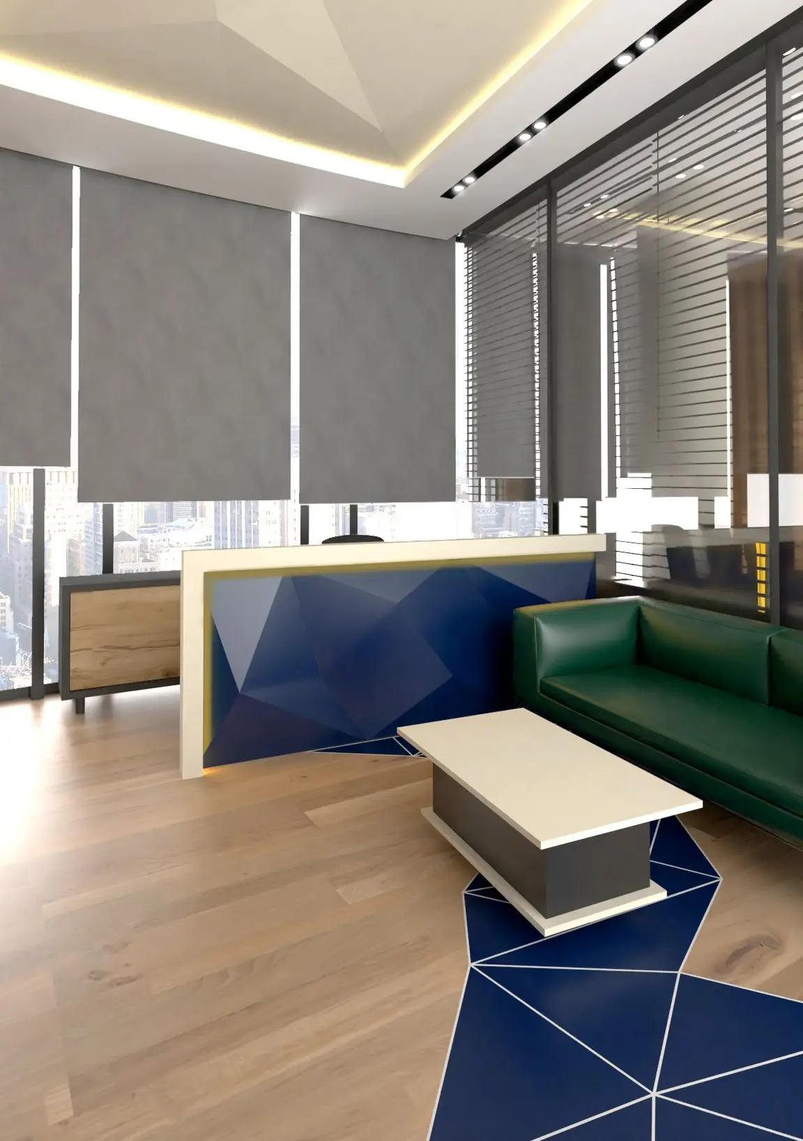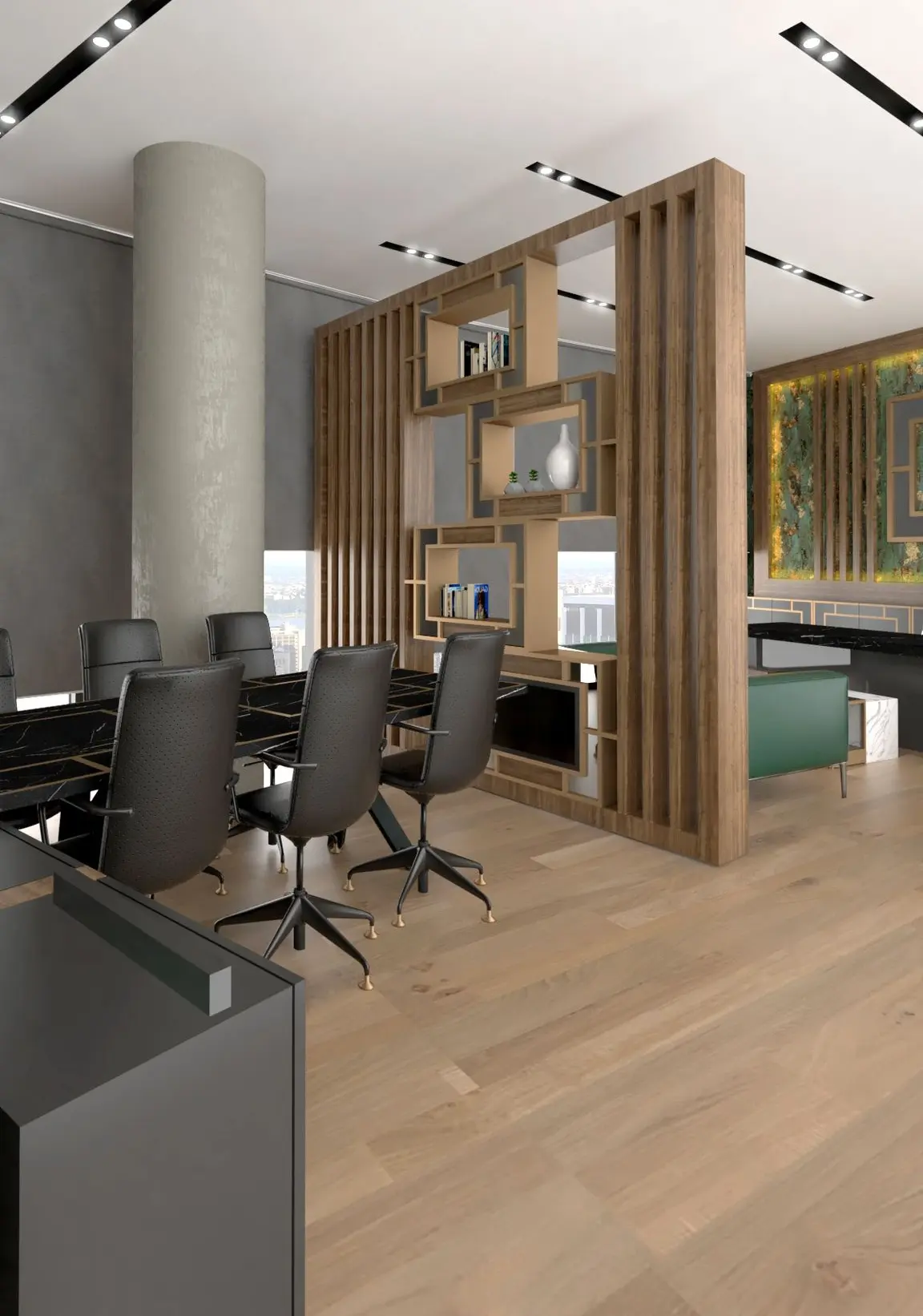 The executive desk and meeting zone are planned with precision, balancing accessibility with privacy. Layered ceiling forms and warm lighting complete the composition, creating visual interest while supporting a balanced lighting strategy for long workdays.