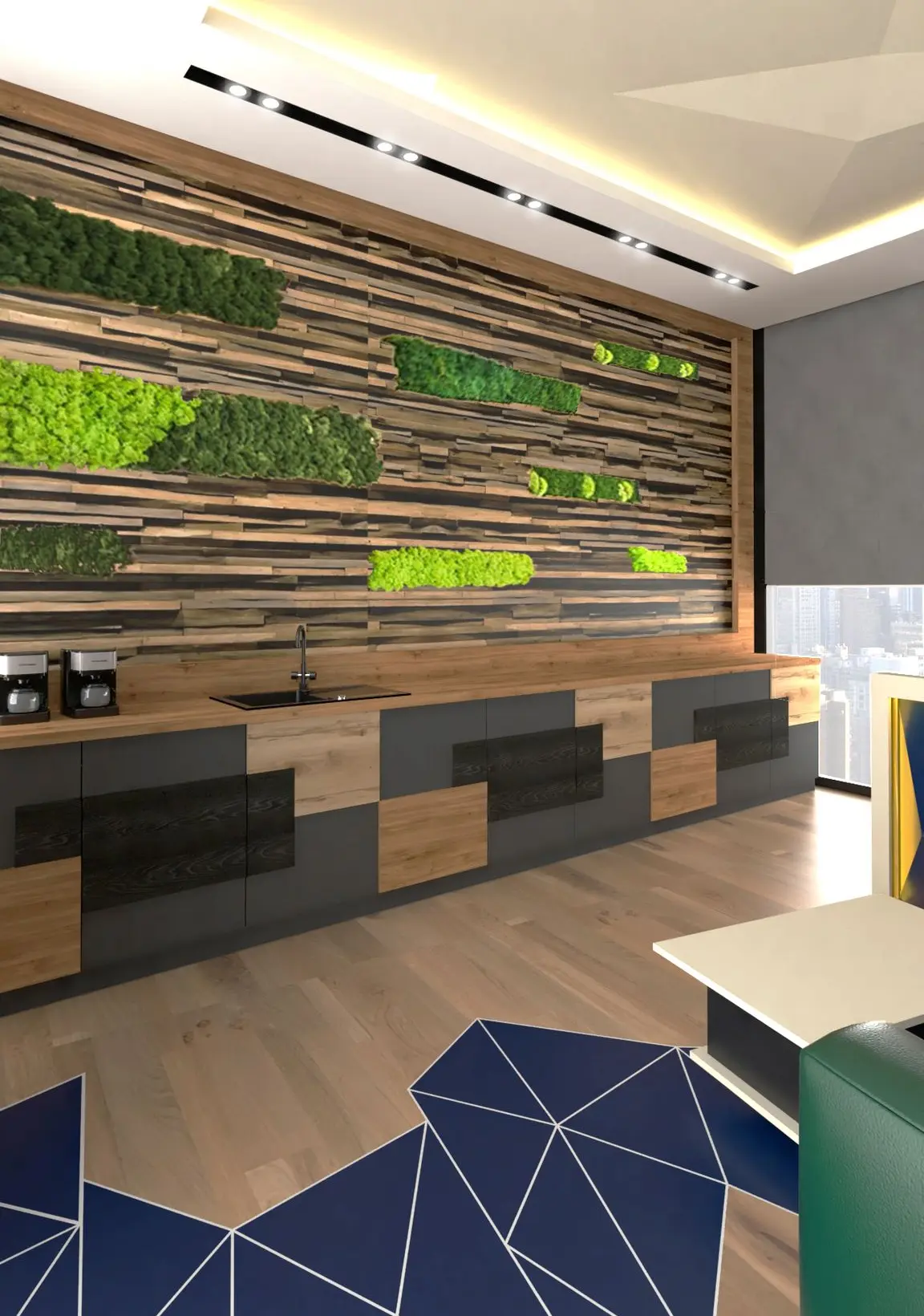 Integrated greenery panels soften the architectural lines and bring a sense of calm to the work environment, reinforcing the connection between nature and focus. Custom shelving units and millwork partitions serve as both functional storage and spatial dividers, enabling thoughtful zoning while maintaining an open, cohesive flow.