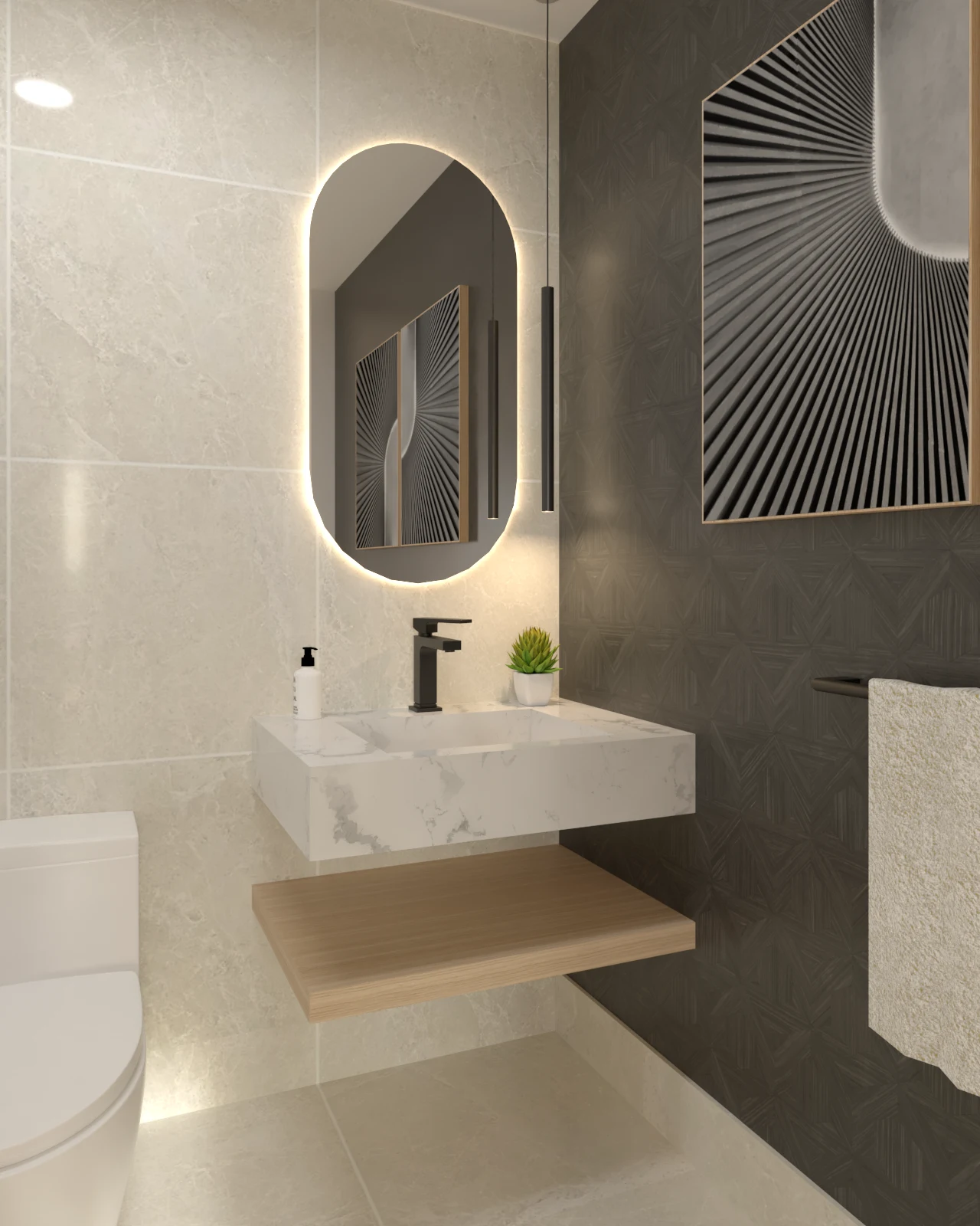 Extending the design beyond the interior, the landscaped outdoor sitting area provides a private retreat, where carefully selected materials and greenery create a serene, inviting environment for relaxation and entertaining. Thoughtful lighting and material interplay continue throughout the exterior, ensuring the outdoor space feels as considered and polished as the interiors.