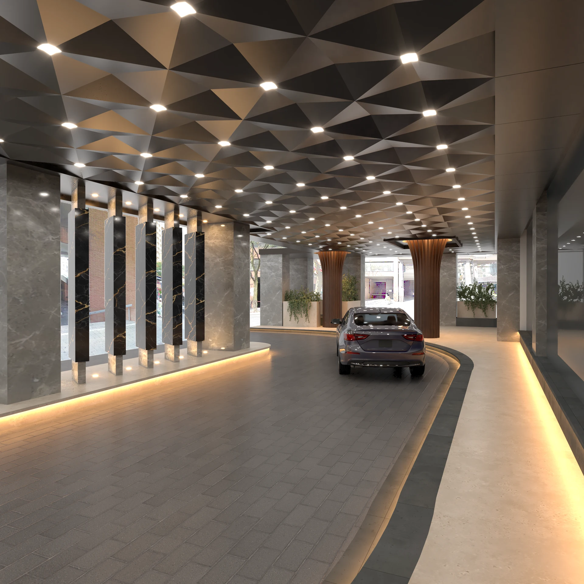 Reimagining the arrival experience, ABN Design designed a valet entrance concept that merges architectural geometry with a refined material palette to create a distinguished first impression. The design balances bold sculptural elements with warm, tactile finishes, setting the stage for an experience that feels contemporary, curated, and seamlessly elevated.